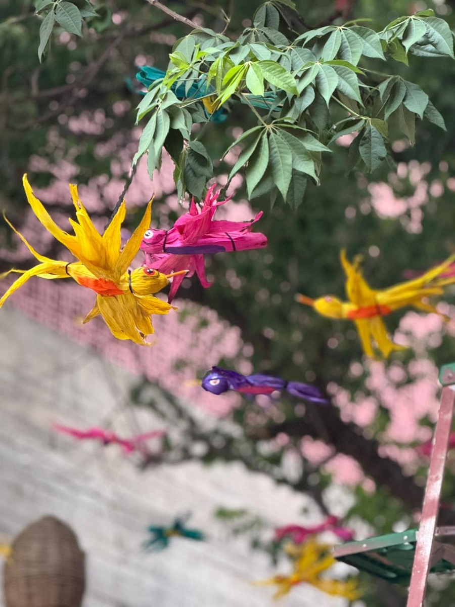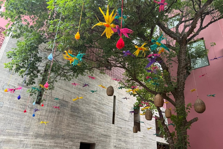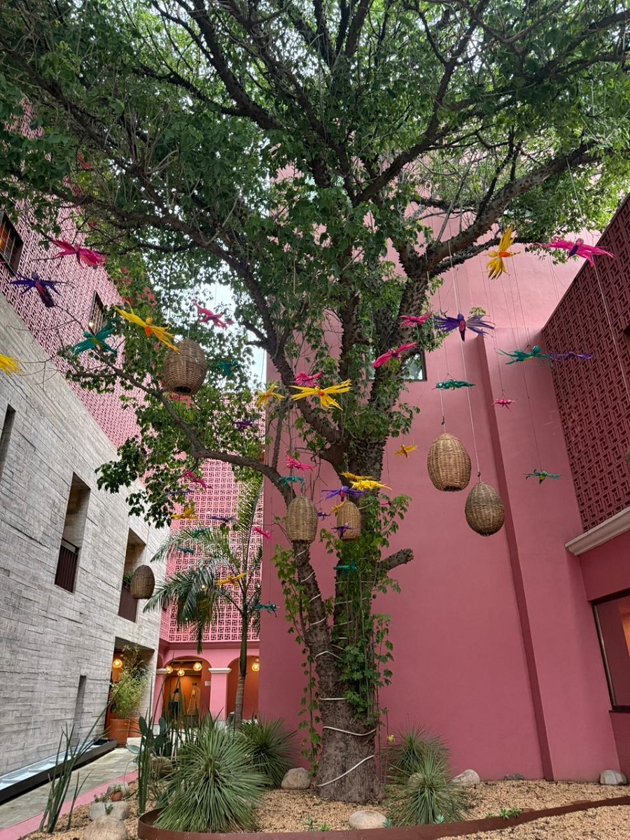 Las bellas piezas artesanales de Huizache, en forma de aves multicolores, fueron integrados al antiguo árbol de pochote que se encuentra en el patio central de hotel, ubicado en una antigua casona porfiriana en el corazón del emblemático barrio de Jalatlaco. Esta sede, con su arquitectura restaurada y que mezcla lo histórico y lo moderno, se convierte en el marco perfecto para el arte oaxaqueño.