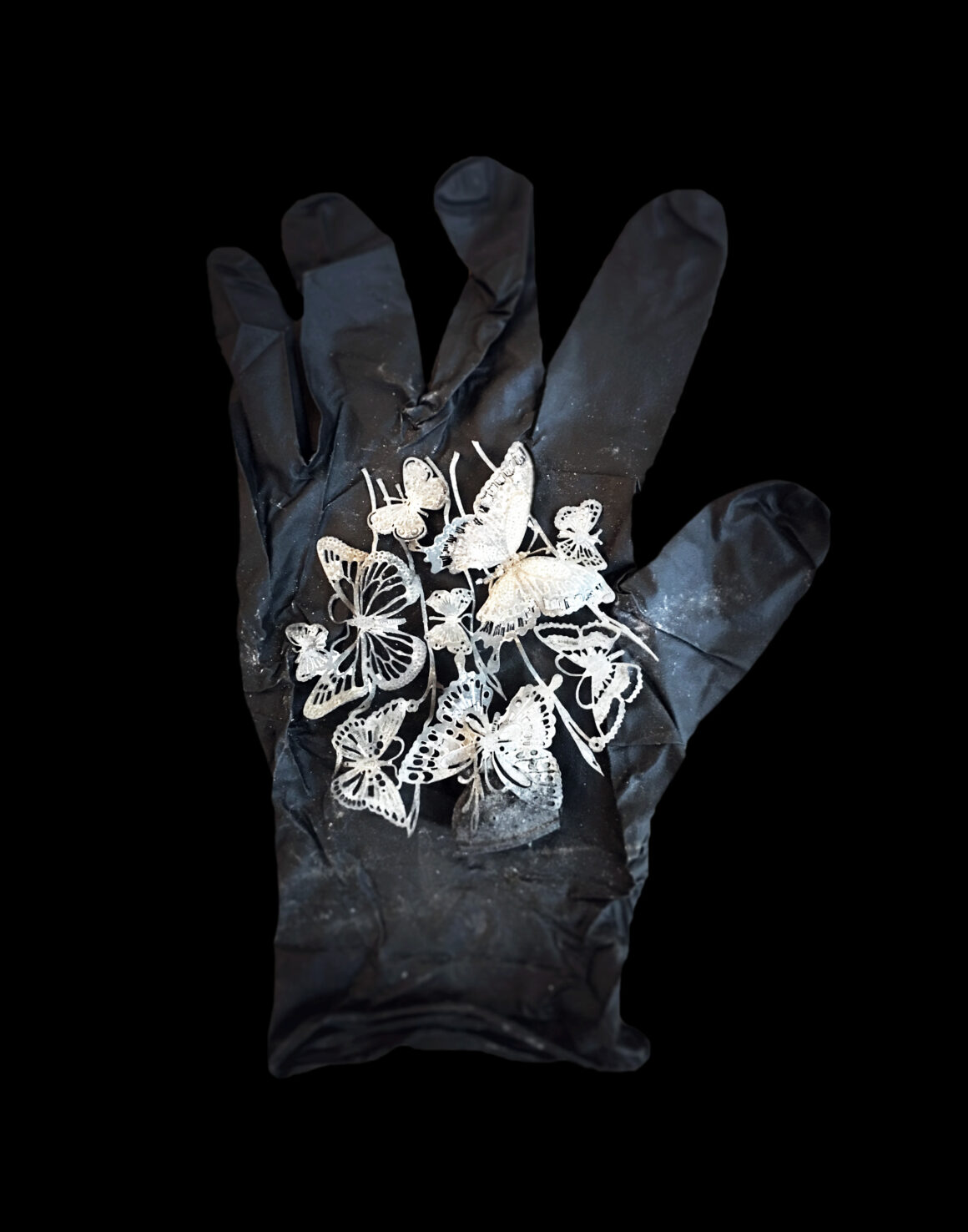 La serie Forraje del Fuego presenta una gran cantidad de reliquias familiares, desde joyas rotas hasta cuerpos de cámaras, partes de muñecas y herramientas de cocina, todo enmarcado por los guantes de plástico negros que se utilizan para limpiar incendios.