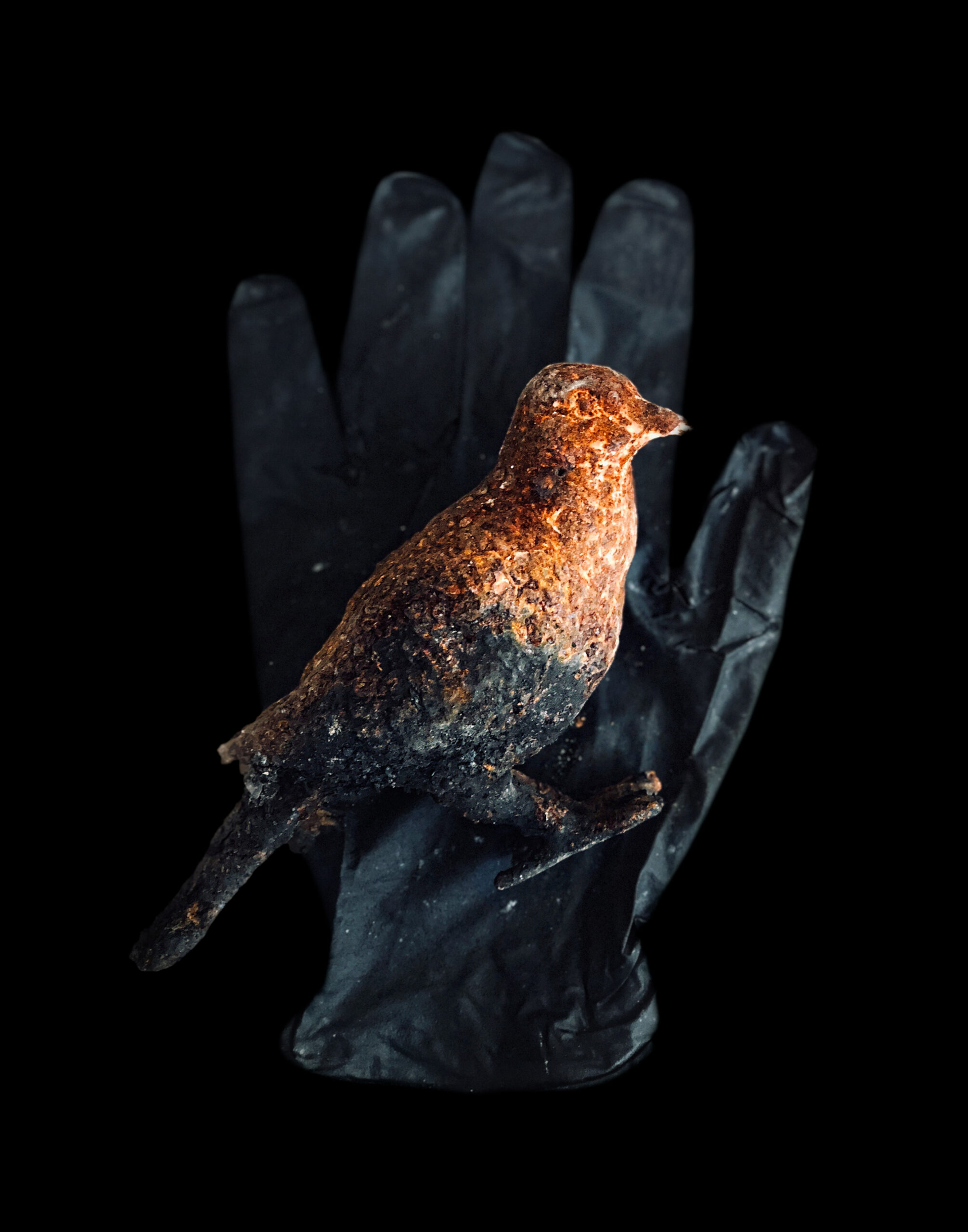 La serie Forraje del Fuego presenta una gran cantidad de reliquias familiares, desde joyas rotas hasta cuerpos de cámaras, partes de muñecas y herramientas de cocina, todo enmarcado por los guantes de plástico negros que se utilizan para limpiar incendios.