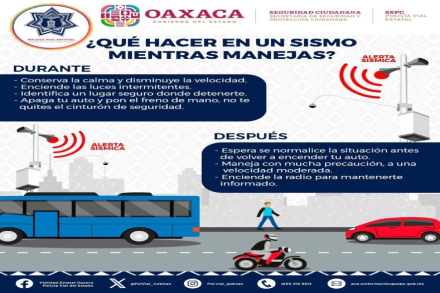 OAXACA, Oax. (sucedióenoaxaca.com/vía COMUNICADO).- En el marco del segundo Simulacro Nacional 2025 programado para este viernes 19 de septiembre a las 12:00 horas, la Policía Vial Estatal desplegará un dispositivo de seguridad vial en la capital oaxaqueña y las 45 delegaciones que integran su estructura en la entidad.
