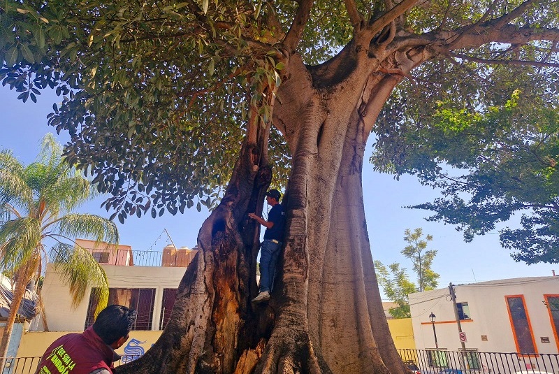 OAXACA, Oax. (sucedióenoaxaca.com/vía COMUNICADO).– Personal técnico de la Secretaría de Medio Ambiente, Biodiversidad, Energías y Sostenibilidad, así como de la Procuraduría de Protección al Ambiente del Estado de Oaxaca (Propaeo), evaluaron los daños en el Árbol Notable de la Capilla de Belén (AHNE-021), ubicado en el Paseo Juárez “El Llano”, luego de registrarse un incendio al pie del ejemplar.