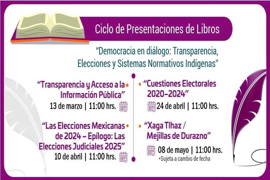 Como parte de este ciclo también se presentarán, en próximas fechas, los libros: “Las Elecciones Mexicanas de 2024. Epílogo: Las Elecciones Judiciales 2025”; “Cuestiones Electorales 2020-2024”; y “Xaga Tlhaz / Mejillas de Durazno”. Estas presentaciones brindarán una gran oportunidad para conocer, aprender y analizar sobre los temas abordados en las obras, a partir de las conversaciones enriquecedoras de las autoras y los autores.